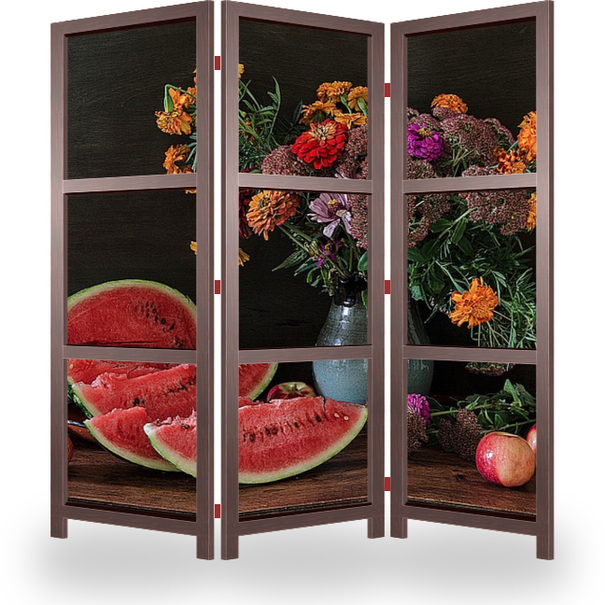 Описание ширмы Натюрморт с осенними цветами, яблоками и арбузом. Живописный и яркий постер может стать украшением вашей кухни или столовой, а так же кафе, ресторана, отеля.