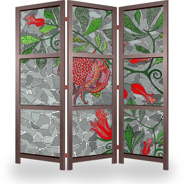 Описание ширмы Описание постера ..Графическая kартина ,, гранаты ,, выполнена на бумаге водными красками(смешенная техника). Декоративная Картина проработана мелкими орнаментоми и яркими цветами. Это картина лучшее украшение вашего интерьера ( Она подайдет в гост