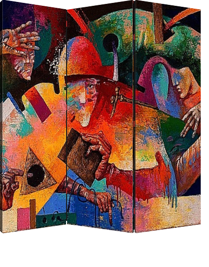 Описание ширмы плотно насыщенное, с яркими ритмами и часто меняющимися сюжетами,назойливо повторяющиеся персонажи в необычных, странных, фантастических обстоятельствах