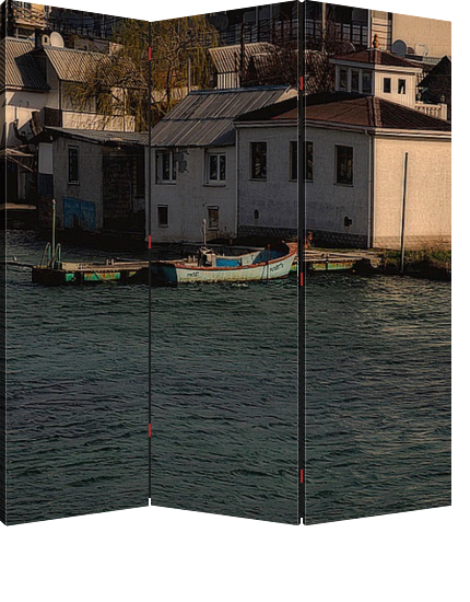 Описание ширмы Живописное утро в бухте Стрелецкой с лодочками у дома, стоящего на берегу .Стилизация под живопись. Такой постер может украсить любое помещение вашего дома, квартиры, офиса, отеля, турфирмы