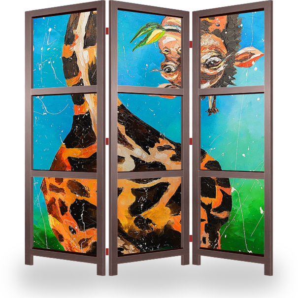 Описание ширмы Любовь Купцова - художник, работающий с различными материалами и техниками. Прежде всего это масло и акварель. Также занимается вышивкой, прижиганием по ткани, росписью стен.Самыми любимыми сюжетами являются животные, птицы, цветы и люди. Особое мест
