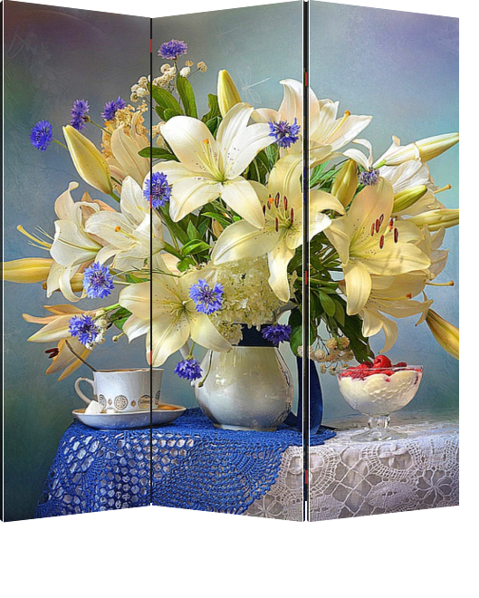 Описание ширмы Букет из белых лилий, васильков и гортензии в кувшине. Чайная пара с чаем. Малина со взбитыми сливками.