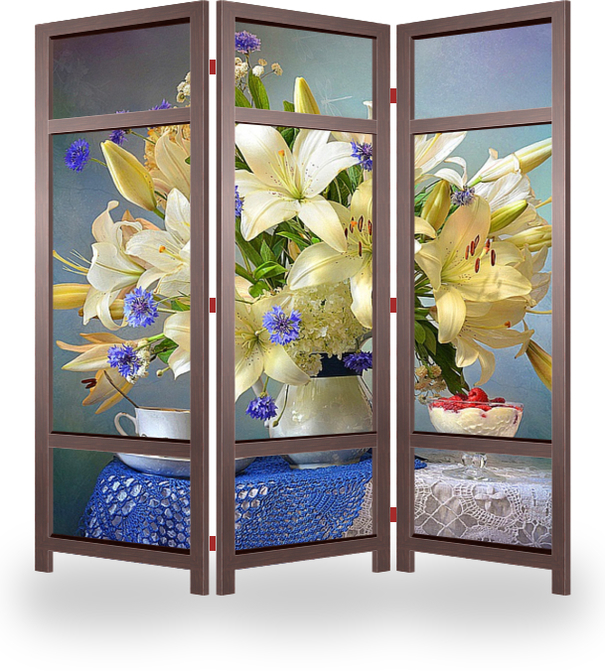 Описание ширмы Букет из белых лилий, васильков и гортензии в кувшине. Чайная пара с чаем. Малина со взбитыми сливками.