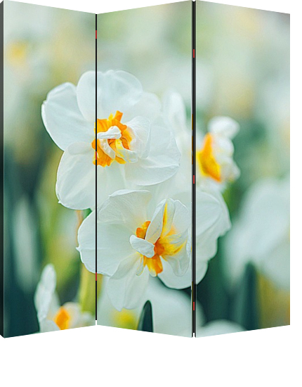 Описание ширмы Древняя легенда о Нарциссе рассказывает, что этот прекрасный юноша умер, не сумев оторвать взгляд от своего отражения в реке. На месте его гибели выросли прекрасные цветы — нарциссы.