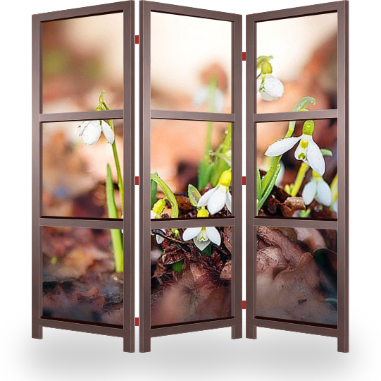 Описание ширмы На фото первые подснежники, недавно пробившиеся сквозь снег и радующиеся теплому весеннему солнышку