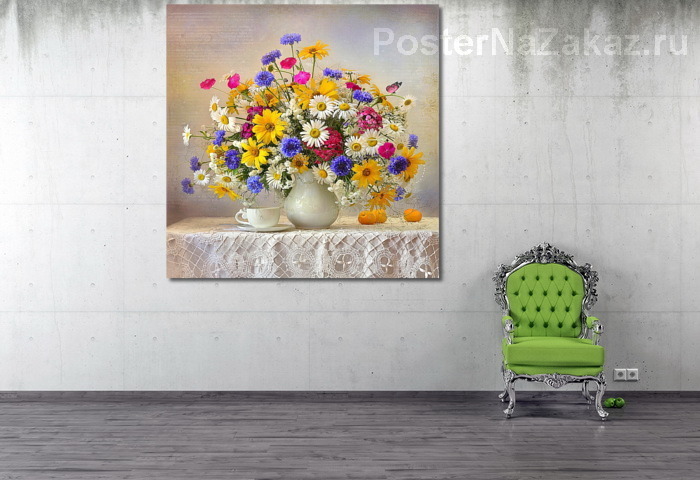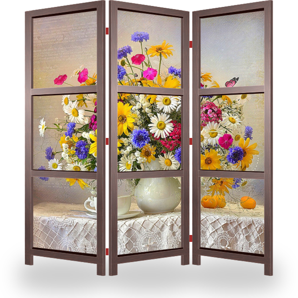 Описание ширмы Букет июньских цветов (васильки, нивяник, гелиопсис) в кувшине. Кружевная скатерть. Чашка с кофе, абрикосы в дополнение