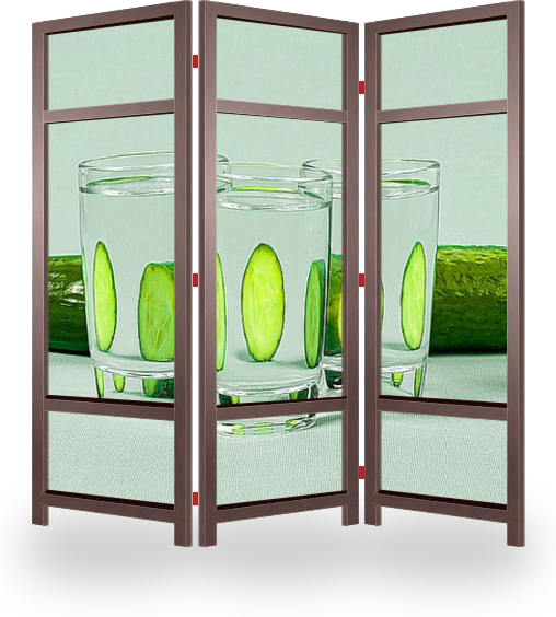 Описание ширмы Постер с разрезанным на три части огурцом расположенным за тремя стаканами с водкой. Огурец без водки это еда, а с водкой - закуска.