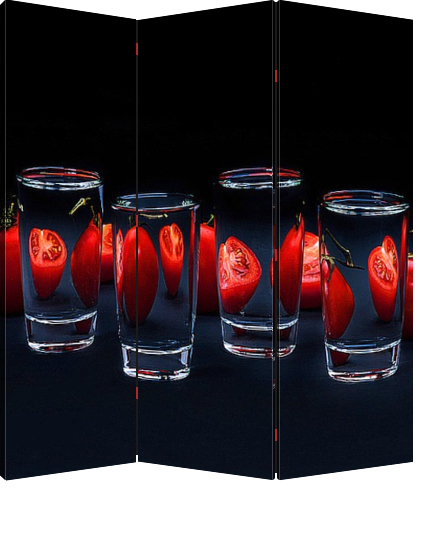 Описание ширмы Красные спелые помидоры на чёрном фоне. Помидоры рассположены за четырьмя стопками с водкой.