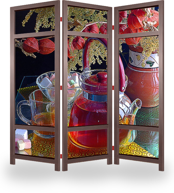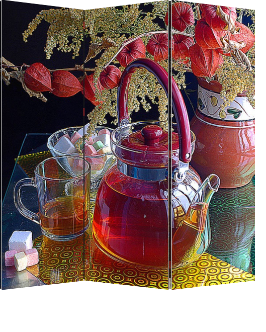 Описание ширмы Натюрморт с чайником из стекла ,чашкой чая и фруктовым сахаром наполнит теплом Вашу кухню. Постер украсит кухню в доме .