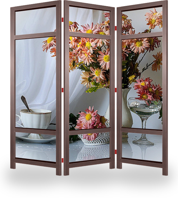 Описание ширмы Натюрморт в классическом стиле в светлых тонах с яркими хризантемами и посудой. Такой постер может украсить любое помещение вашего дома, квартиры, отеля .