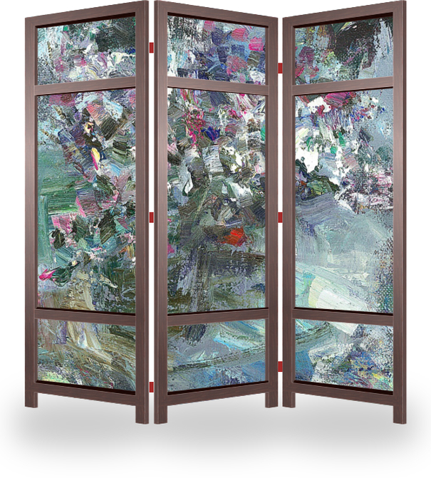 Описание ширмы живописный натюрморт с цветами на серебряном подносе, отражение и цветовое единство в решении пространства.