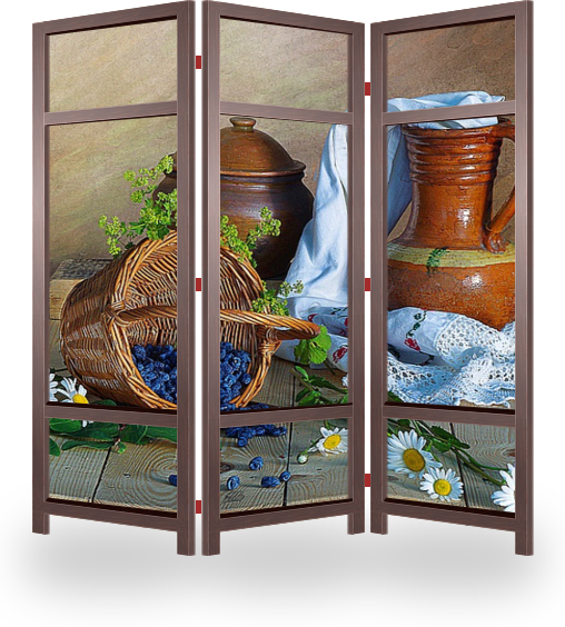 Описание ширмы Натюрморт в деревенском стиле с ягодами жимолости , глиняной посудой и россыпью ромашек .