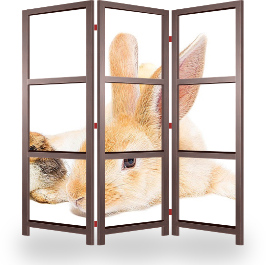 Описание ширмы Рыжий кролик и цыплёнок снятые на белом фоне. Изолированная фотография