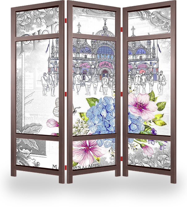 Описание ширмы Постер с изображением Площади Святого Марка в Венеции на фоне крупных цветков гортензии с бабочками в стиле прованс украсит и дополнит Ваш интерьер. Прекрасно подойдет для спальни и гостиной.