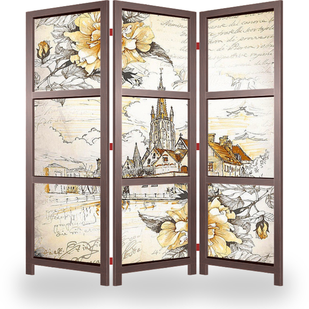 Описание ширмы Постер с изображением церкви Богоматери в Брюгге, Бельгия, на фоне крупных цветков розы в стиле прованс украсит и дополнит Ваш интерьер. Прекрасно подойдет для спальни и гостиной.