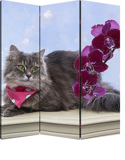 Описание ширмы постер с портретом молодой сибирской кошки с веткой орхидеи, создаст нежную, воздушную атмосферу