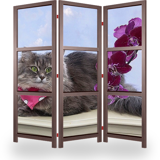 Описание ширмы постер с портретом молодой сибирской кошки с веткой орхидеи, создаст нежную, воздушную атмосферу