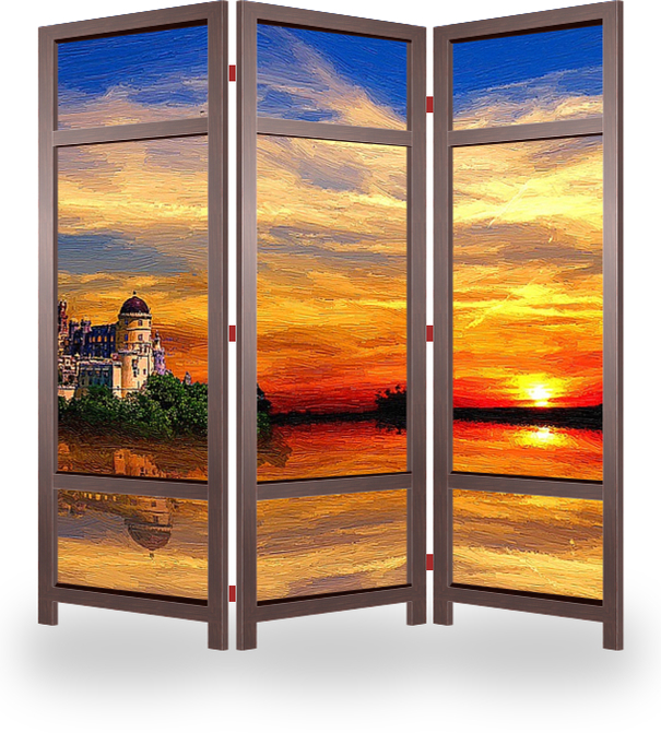 Ширма эконом отлично подойдет для временного размещения, рекламы, для отгораживания объектов интерьера и его дополнения. Лицевая сторона с изображением, обратная сторона открытый каркас