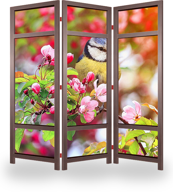 Описание ширмы милая птица лазоревка сидит на ветках цветущей яблони в весеннем солнечном саду