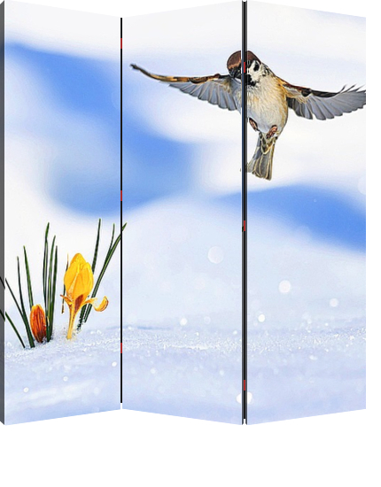 Описание ширмы маленькая птица воробей порхает над цветком желтого подснежника, пробивающегося из под снега весной