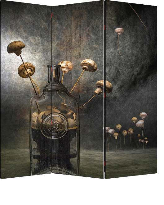 Описание ширмы Из жизни предметов...."Грибы" - стилизация бытовых форм, попытка довести сюжет натюрморта до условностей эмоций и чувств. Попытка заставить предметы соучаствовать в искусственно созданных и придуманных историях с использованием приёмов коллажа и комп
