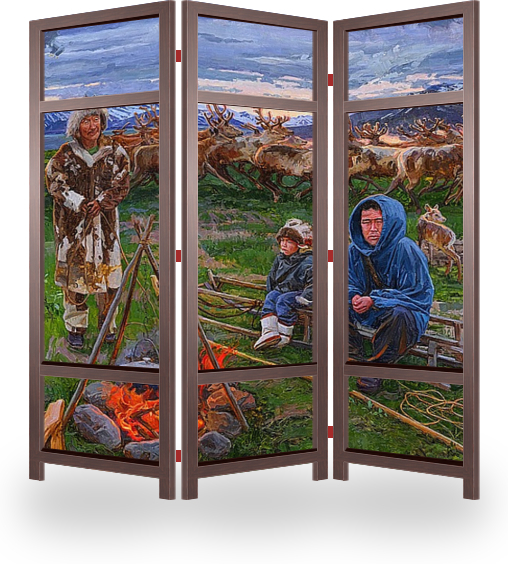 Описание ширмы Для северных народов олень самое главное в жизни. Это и жилище, и одежда, и еда. С раннего детства мальчиков обучают обращению оленем. Вместе с такими стадами семья кочует на огромные расстояния.
