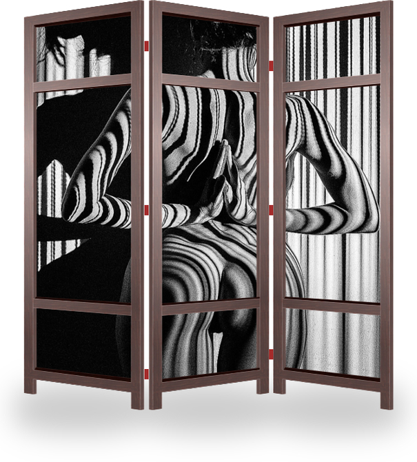 Описание ширмы Обнаженная девушка, пленочная фотография, черно белое, девушка освещена проекцией вертикальных полос, в жестком сложном светотеневом рисунке света подчеркнут объем и фактура модели.