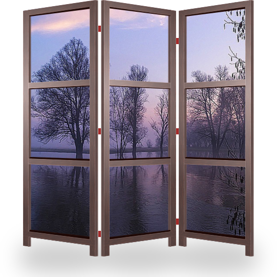Описание ширмы Весенний паводок на прекрасной реке Псел. Прохладное апрельское утро в холодных синих и фиолетовых оттенках.