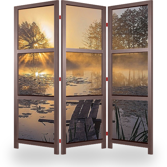 Описание ширмы Невероятно яркое летнее утро на прекрасной реке Псел! Густой туман окутал все вокруг густой пеленой! Лучи солнца пробиваются сквозь кроны деревьев и ложится на поверхность реки.