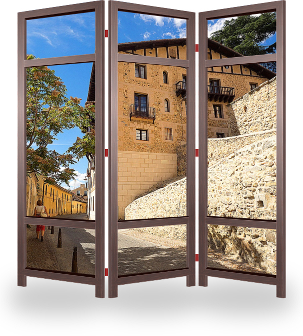 Описание ширмы Сеговия запоминается своей уютной центральной площадью с великолепным кафедральным собором и величественной колокольней, алькасаром, необычными по форме церквями с аркадами и величественным римским акведуком, самым длинным в Европе