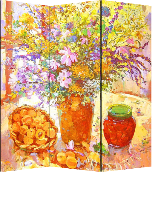 Описание ширмы Середина лета - самая благодатная пора: зреют фрукты, буйно цветут полевые травы. Рука так и тянется к краскам. Цель - аппетитный и жизнерадостный натюрморт