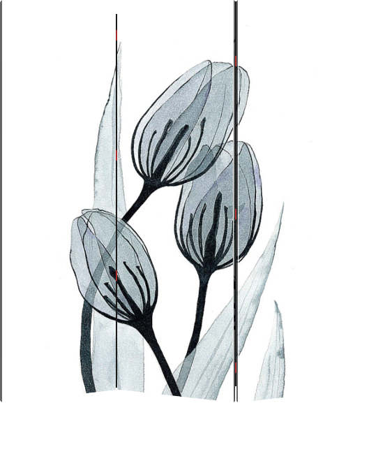 Описание ширмы Вдохновленная сериями фотографий цветов под рентгеновскими лучами, я создала серию прозрачных цветов акварелью. Иллюстрации выполнены в уникальной авторской технике путем послойного наложения цвета. Благодаря этой технике,удается достигнуть эффекта п