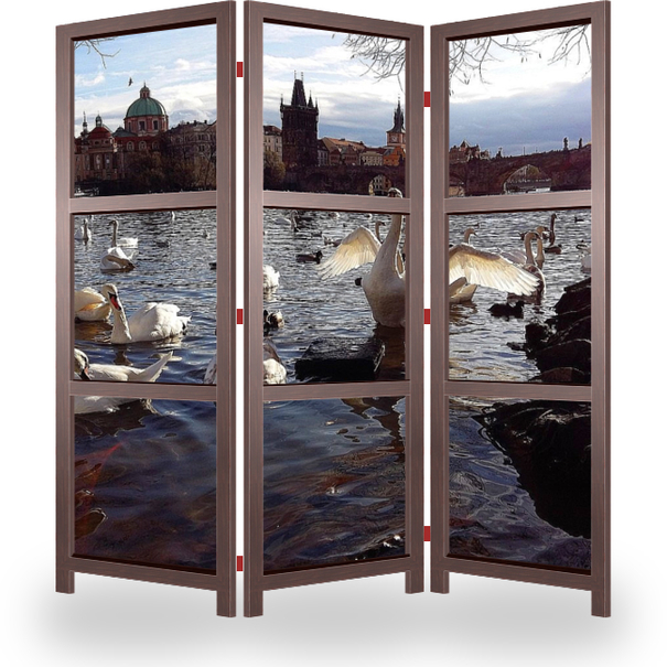 Описание ширмы Эти величественные создания обитают на реке Влтаве и маленьких прудах круглый год. Прогуливаясь по набережной, трудно не заметить их изогнутые снежные шеи, ярко-красные клювы и массивные тела