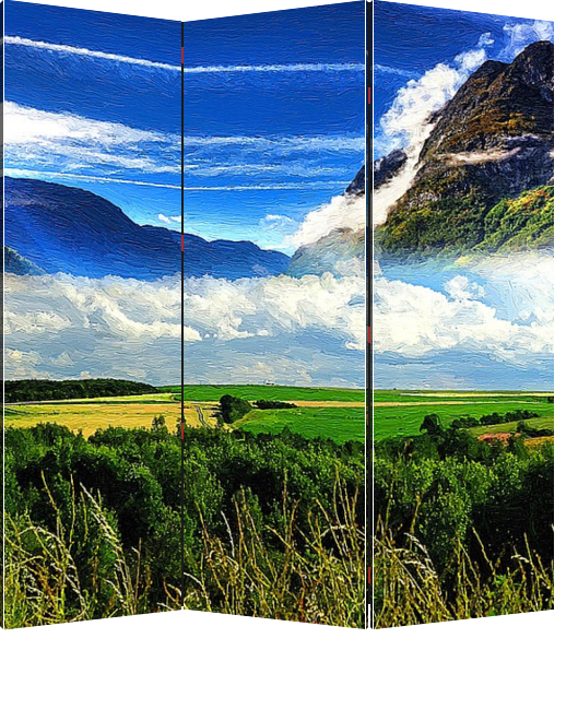 Описание ширмы То ли во сне, толь наяву Увидел я прекрасную страну. Там воздух чистотой пьянит, Родник хрустальный с гор бежит. Там звёзды падают с небес, Там у озера растёт волшебный лес. Там в облаках огромная гора Сверкает как обломок серебра.