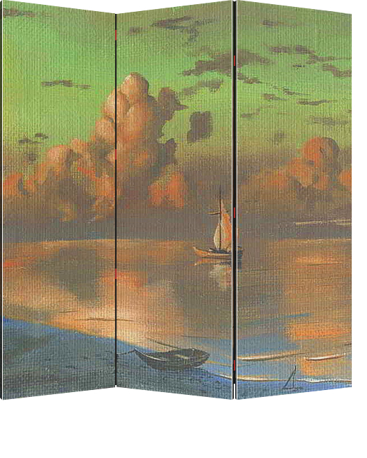 Описание ширмы Почти сюрреалистический сюжет с лодками на берегу тихого спокойного моря на закате, вдохновивший на создание этой работы по мотивам произведений Айвазовского и старых мастеров конца XIX - начала XX веков.