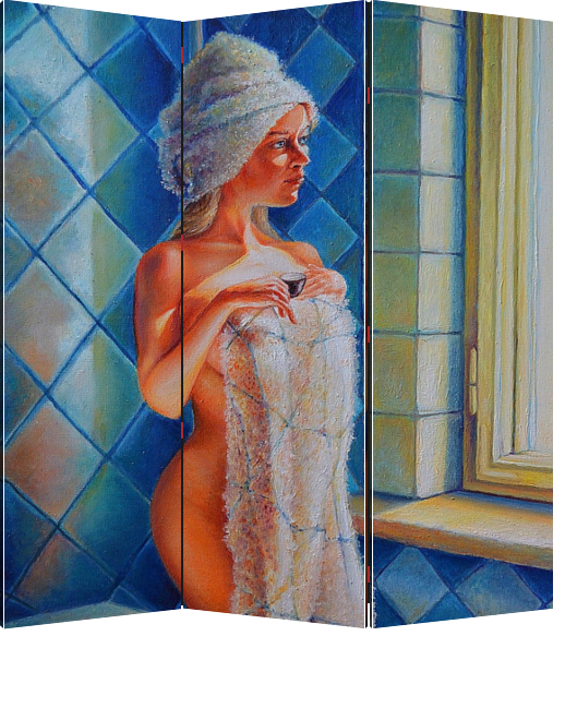 Описание ширмы Утренний кофе юной девушки, вышедшей из ванной после душа на старой кухне, выложенной синей плиткой, и освещенной ярким прямым солнечным светом. Игра света, цвета и геометрии пространства в преддверии начинающегося дня и чувственность геометрии женск