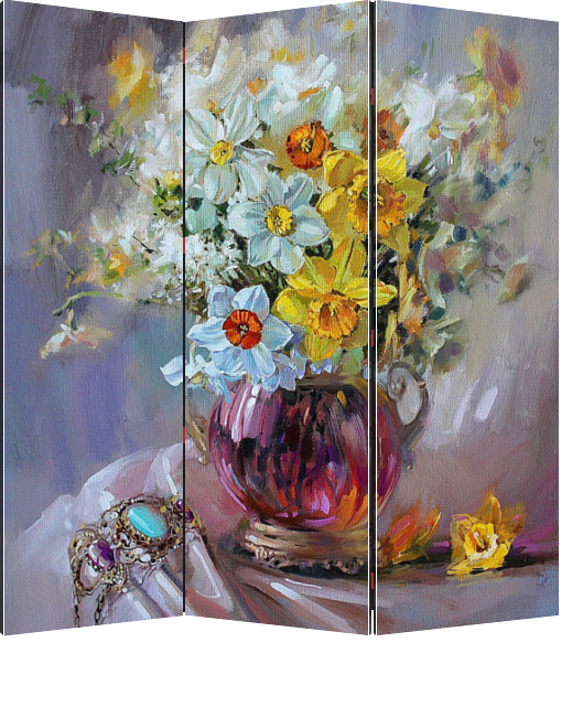 Описание ширмы картина написана масло на холсте Рогозиной С. в 2018 г. Натюрморт весенний. Нарциссы. Настроение солнечное .
