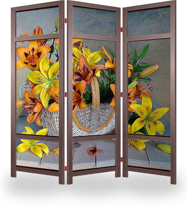 Описание ширмы Натюрморт с букетиком желтых , оранжевых лилий. Постер яркими красками порадует Вас в любое время года ,украсив интерьер.