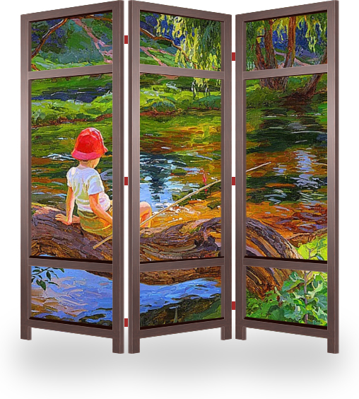 Описание ширмы Покосившаяся над водой ива - любимое место для деревенской ребятни. С неё и понырять можно и рыбу половить.