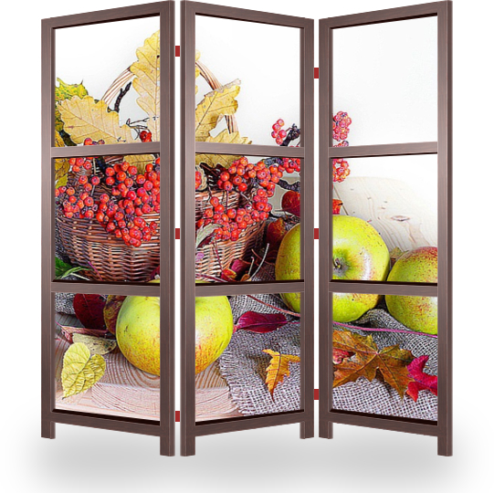 Описание ширмы Натюрморт с ветками рябины , яблоками , осенней листвой на белом фоне. Постер яркими красками порадует Вас в любое время года ,украсив интерьер.