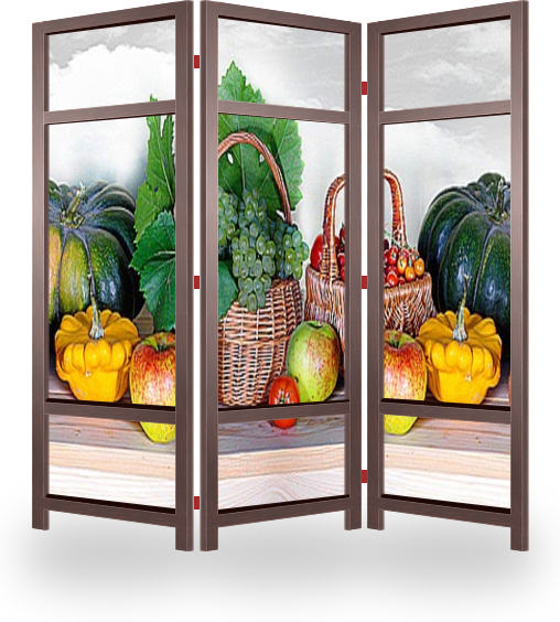 Описание ширмы Натюрморт - панорама с фруктами и овощами на большом столе . Простер яркими красками украсит любой интерьер вашего дама .