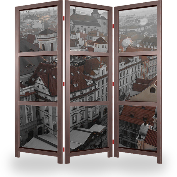 Описание ширмы Прага. Поздняя осень, теплый погожий вечер. Солнце клонится к закату. Старый город весь как на ладони с высоты птичьего полета. Лучами предзакатного солнца освещаются, крыши, дома, улочки, башенки.
