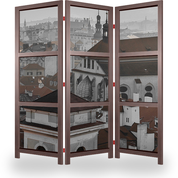 Описание ширмы Прага. Поздняя осень, теплый погожий вечер. Солнце клонится к закату. Старый город весь как на ладони с высоты птичьего полета. Лучами предзакатного солнца освещаются, крыши, дома, улочки, башенки.