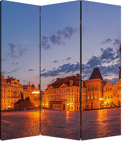 Описание ширмы Ранее утро в чешской столицы Прага, Староместкая площадь, солнце ещё не взошло, старые здания и площадь освещены светом фонарей, вид на Тынский храм и памятник Яну Гусу, ощущение, что вернулся на много столетий назад