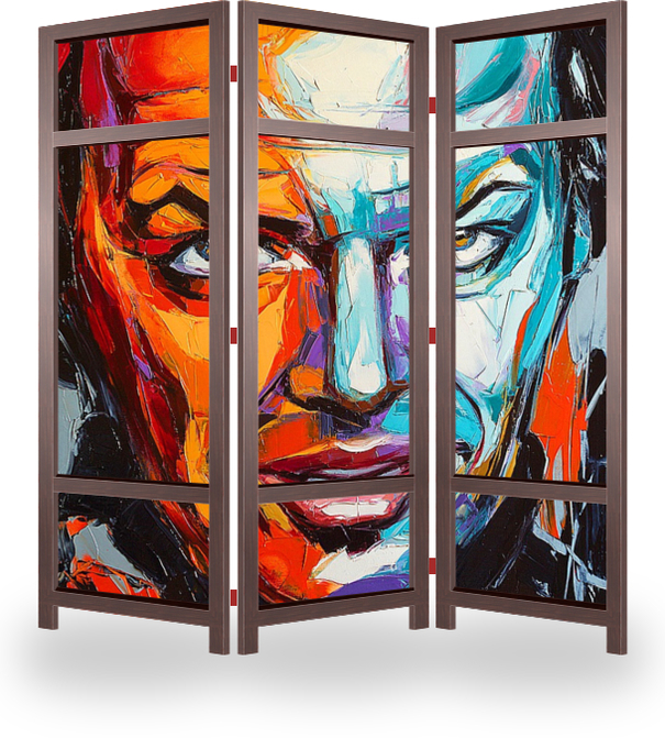 Описание ширмы Из коллекции "эмоции в красках". Смесь абстрактного стиля, фовизма и поп-арта, портрет-компиляция из разных образов и воспоминаний. Выполнен на холсте исключительно мастихином, крупные размашестые мазки придающие стиль и силу выражению. Для оформлени
