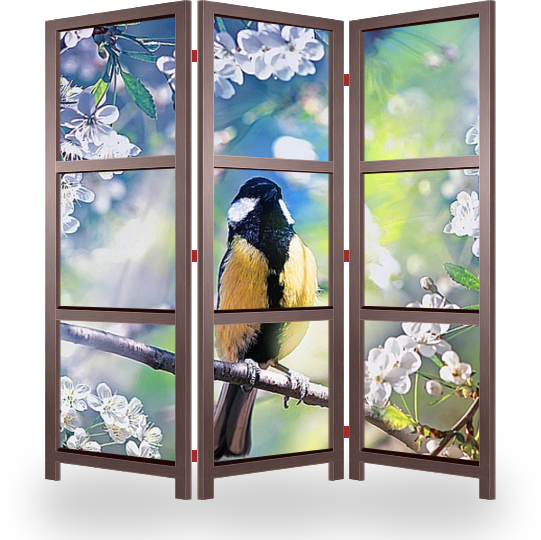 Описание ширмы маленькая птица синица сидит в весеннем майском саду в окружении веток вишни с белыми цветами