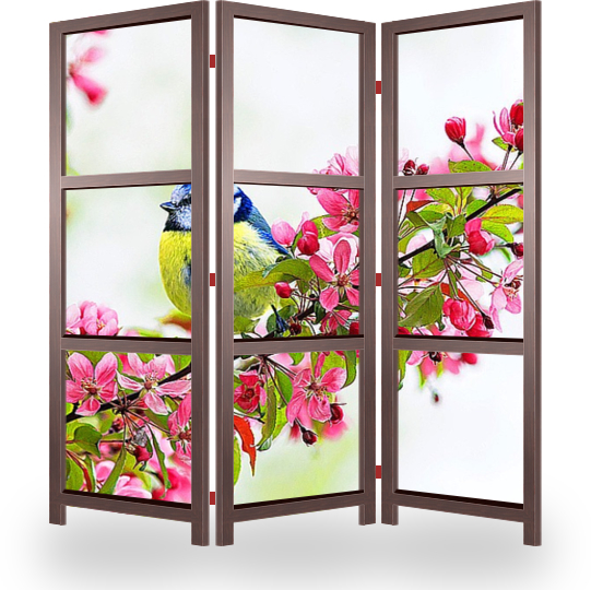 Описание ширмы маленькая красивая птица лазоревка сидит среди веток яблони с розовыми майскими цветами
