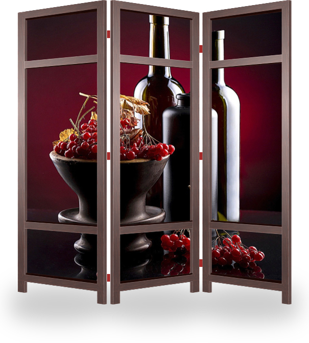 Описание ширмы Натюрморт с калиной красной и стеклянными бутылками. Спелые ягоды калины являются прекрасным объектом для фотосъёмки в различных условиях и всегда прекрасно смотрятся на любом фоне.