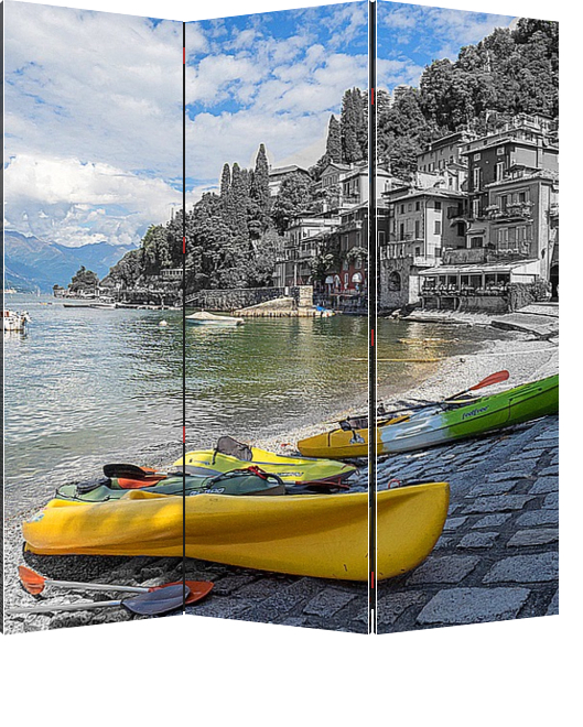 Описание ширмы Озеро Комо является третьим по величине озером в Италии и одним из самых глубоких - до 410 м. Состоит из трех рукавов длиной от 26 километров. Общая длина озера - 47 километров. На берегах озера располагаются разноцветные городки - Белладжио, Варенна