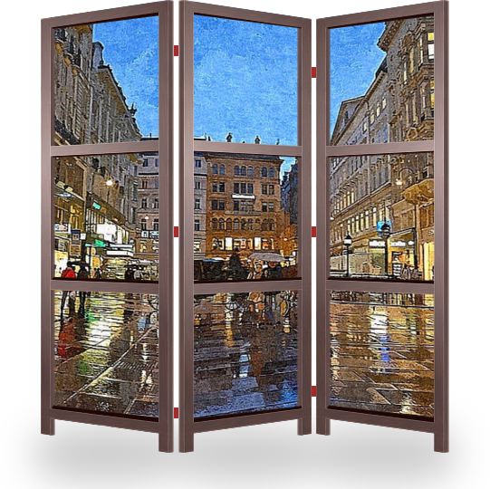 Описание ширмы Двое под одним зонтом или прогулка по вечерней Вене в дождь. Такой постер может украсить любое помещение вашего дома, квартиры, офиса, отеля, турфирмы.